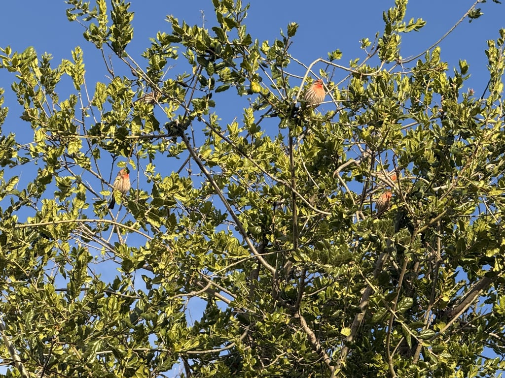 Note: As I went for my afternoon walk, the loud chirping of house finches from the scrub oak canopy attracted me. Such avian music is what my soul needs to restore its sanity.