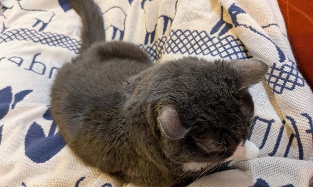 Oof! you surprise me, grey ball of purring delight jumping on my lap.