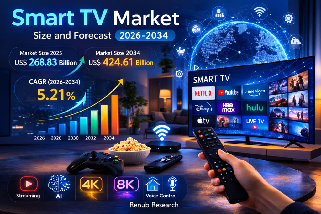 The global Smart TV Market is entering a new era of sustained growth and innovation. According to Renub Research, the Smart TV Market is expected to reach US$ 424.61 billion by 2034, up from US$ 268.83 billion in 2025, expanding at a CAGR of 5.21% from 2026 to 2034. Rising disposable incomes, expanding internet penetration, rapid urbanization, and evolving consumer demand for immersive home entertainment are fueling this expansion worldwide.