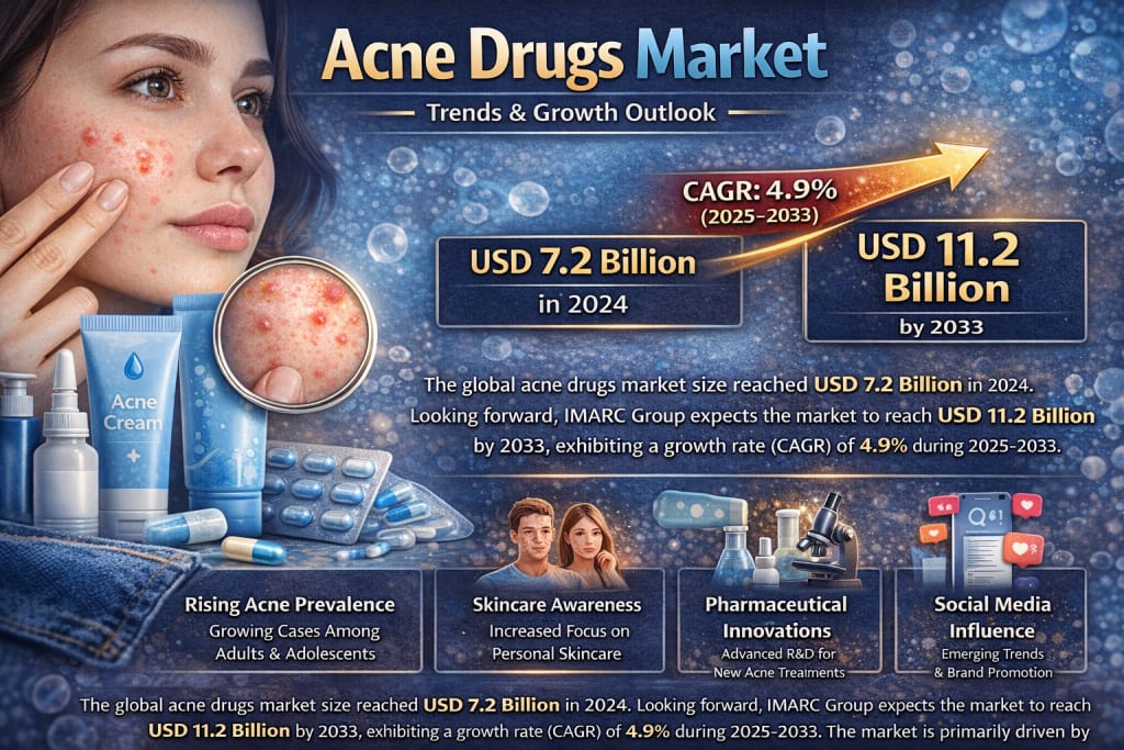 The global acne drugs market size reached USD 7.2 Billion in 2024. Looking forward, IMARC Group expects the market to reach USD 11.2 Billion by 2033, exhibiting a growth rate (CAGR) of 4.9% during 2025-2033. The market is primarily driven by the rising prevalence of acne among adults and adolescents, the increasing awareness and emphasis on skincare, the ongoing advancements in pharmaceutical R&D for innovative treatments, and the emerging social media influence.