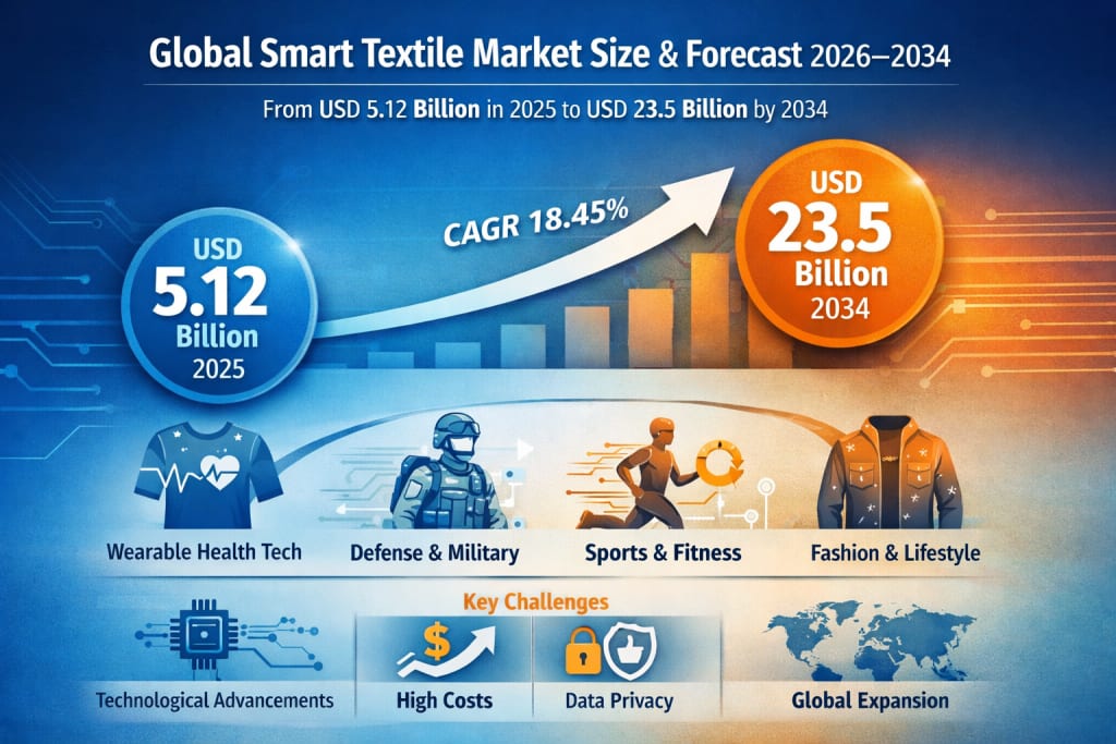 The global smart textile market is entering a transformative decade. According to Renub Research, the Global Smart Textile Market size is anticipated to escalate from USD 5.12 billion in 2025 to USD 23.5 billion by 2034, expanding at a remarkable CAGR of 18.45% between 2026 and 2034.