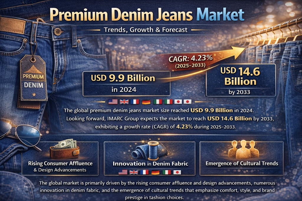 The global premium denim jeans market size reached USD 9.9 Billion in 2024. Looking forward, IMARC Group expects the market to reach USD 14.6 Billion by 2033, exhibiting a growth rate (CAGR) of 4.23% during 2025-2033. The global market is primarily driven by the rising consumer affluence and design advancements, numerous innovation in denim fabric, and the emergence of cultural trends that emphasize comfort, style, and brand prestige in fashion choices.