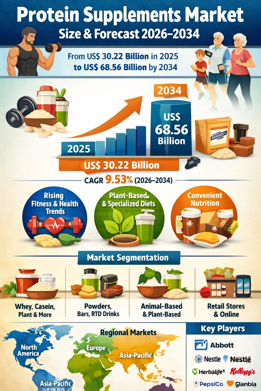 The global Protein Supplements Market is entering a transformative growth phase. According to Renub Research, the market is projected to expand from US$ 30.22 billion in 2025 to US$ 68.56 billion by 2034, registering a compelling CAGR of 9.53% from 2026 to 2034.